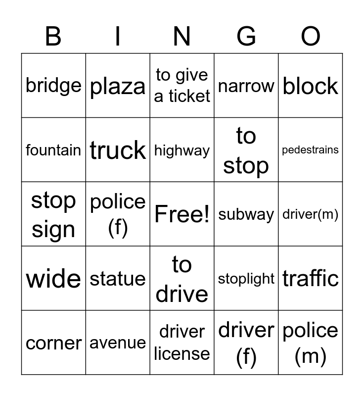 This bingo card has a free space and 24 words: statue, avenue, highway, corner, block, bridge, fountain, plaza, subway, to drive, to stop, stop sign, stoplight, traffic, truck, driver (f), driver(m), to give a ticket, pedestrains, police (f), police (m), wide, narrow and driver license.