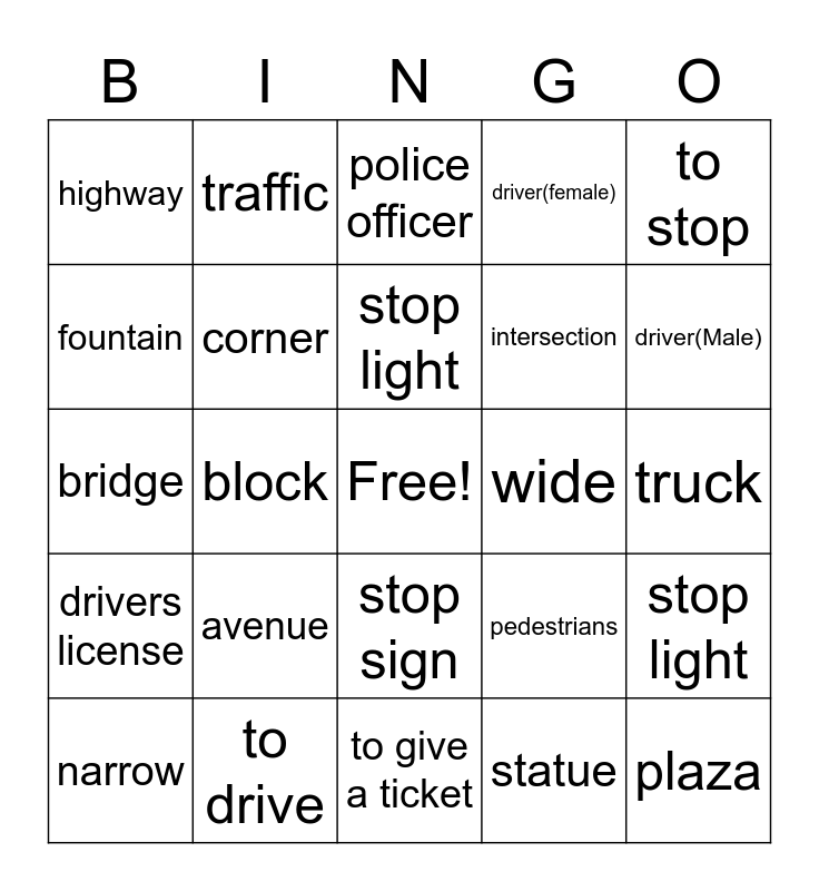 This bingo card has a free space and 24 words: avenue, to drive, stop light, narrow, to stop, highway, fountain, traffic, wide, stop sign, intersection, bridge, pedestrians, stop light, corner, statue, truck, police officer, driver(Male), block, plaza, drivers license, driver(female) and to give a ticket.