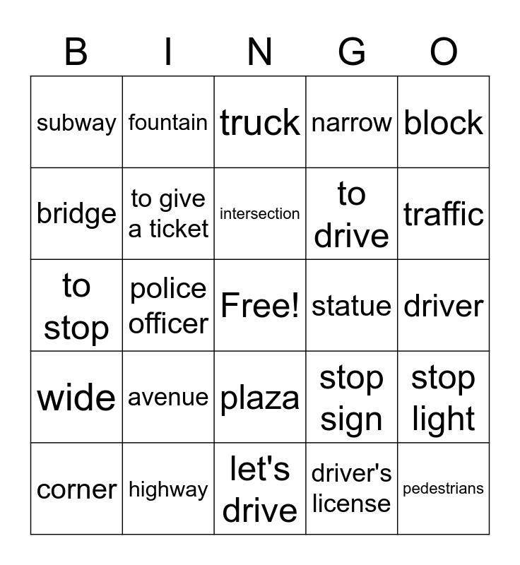 This bingo card has a free space and 24 words: avenue, highway, intersection, corner, block, subway, bridge, fountain, statue, plaza, to drive, to stop, stop sign, stop light, to give a ticket, driver's license, driver, truck, traffic, police officer, pedestrians, wide, narrow and let's drive.
