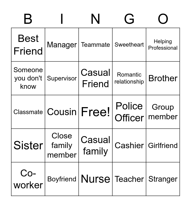 This bingo card has a free space and 24 words: Close family member, Boyfriend, Casual Friend, Co-worker, Helping Professional, Best Friend, Someone you don't know, Manager, Police Officer, Casual family, Romantic relationship, Classmate, Cashier, Girlfriend, Supervisor, Teacher, Group member, Teammate, Brother, Cousin, Stranger, Sister, Sweetheart and Nurse.