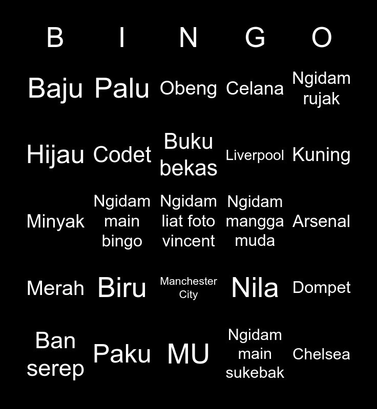 This bingo card has a free space and 24 words: Biru, Paku, Buku bekas, Ban serep, Ngidam rujak, Baju, Hijau, Palu, Ngidam mangga muda, Manchester City, Liverpool, Minyak, Nila, Dompet, Codet, Ngidam main sukebak, Arsenal, Obeng, Kuning, Ngidam main bingo, Chelsea, Merah, Celana and MU.