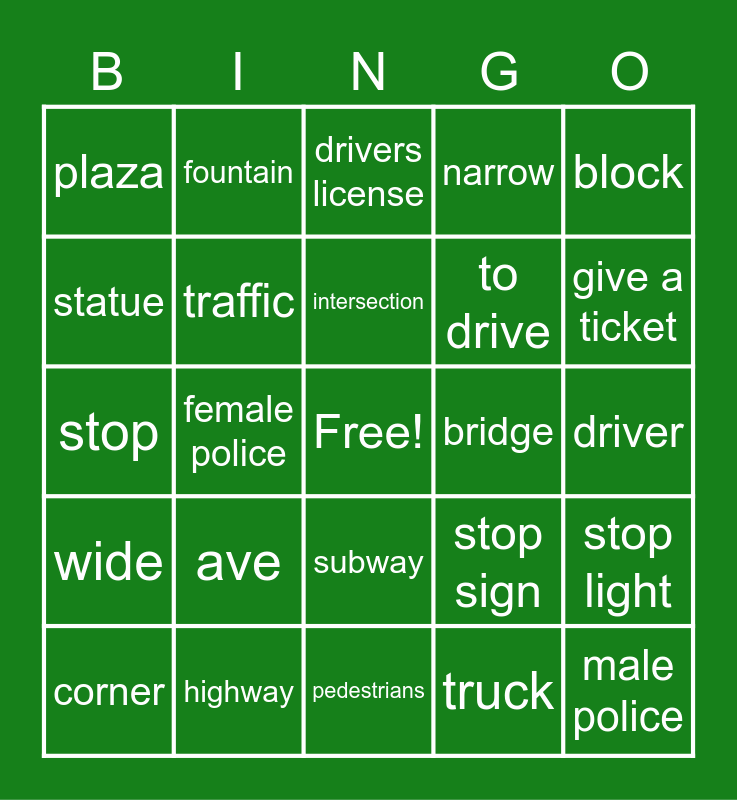 This bingo card has a free space and 24 words: ave, highway, intersection, corner, block, plaza, statue, fountain, bridge, subway, to drive, stop, stop sign, stop light, traffic, truck, driver, drivers license, give a ticket, female police, male police, wide, narrow and pedestrians.