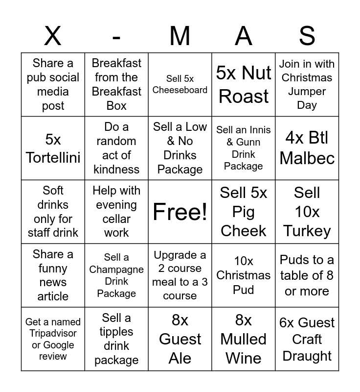 This bingo card has a free space and 29 words: Get a named Tripadvisor or Google review, Starters to a table of 8 or more, Help with evening cellar work, Give a Christmas Card, Share a pub social media post, Sell 5x Cheeseboard, Do a random act of kindness, Sell a Champagne Drink Package, Sell 5x Pig Cheek, Sell a tipples drink package, Sell 10x Turkey, 6x Guest Craft Draught, 8x Guest Ale, 8x Mulled Wine, 4x Btl Malbec, Sell 5x Terrine, Upgrade a 2 course meal to a 3 course, Share a funny news article, Join in with Christmas Jumper Day, Soft drinks only for staff drink, 10x Christmas Pud, Sell a wine drinks package, Sell an Innis & Gunn Drink Package, 5x Tortellini, 5x Nut Roast, Breakfast from the Breakfast Box, Puds to a table of 8 or more, Sell a Low & No Drinks Package and Try a Fayre Menu item for staff food.