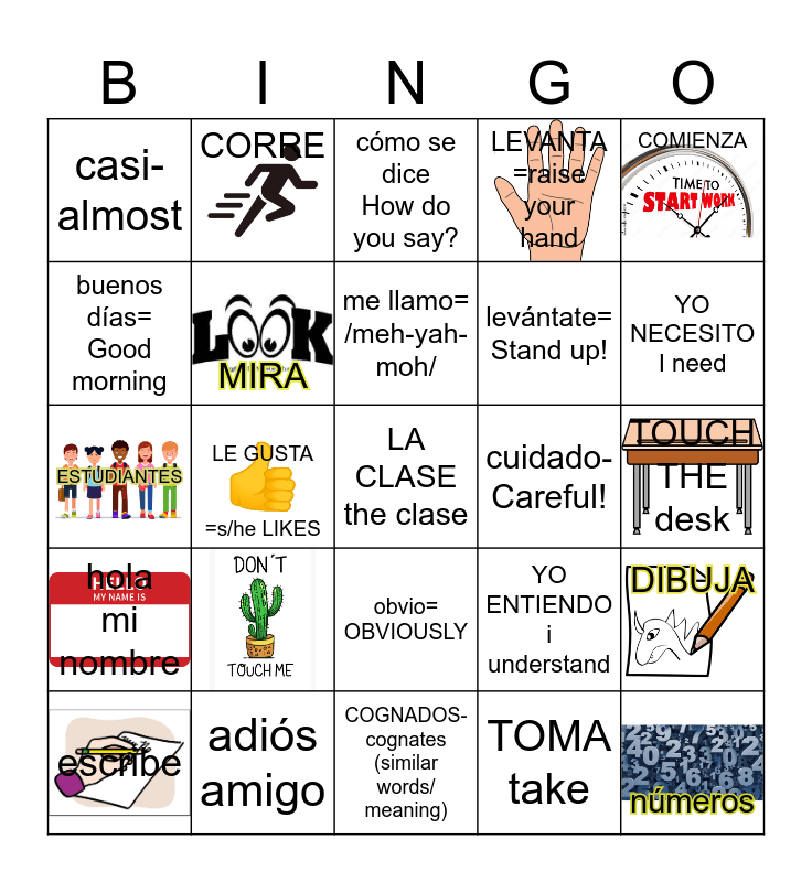 This bingo card has 32 images and 57 words: is called se llama, adiós amigo, el papel =the PAPEL, hola mi nombre, números, MIRA, siéntate= Sit down!, levántate= Stand up!, hambre= hungry, LEVANTA =raise your hand, Lo siento. = Sorry!, buenos días= Good morning, CHICOS boys, señor- Mr., casi- almost, LA CLASE the clase, COMIENZA, LOS POLLITOS DICEN the chicks say, me llamo= /meh-yah-moh/, cuidado- Careful!, cómo se dice How do you say?, escribe, TOMA take, bathroom, PERMISO permission, TISÚ, esta chica= THIS GIRL, DIBUJA, FRÍO, CAMINA, YO SOY INTELIGENTE = I am smart, please, COME, TOUCH THE desk, CORRE, NECESITA needs, TIENE UN LAPIZ has a pencil, LE GUSTA =s/he LIKES, BUSCA = look for, ESTUDIANTES, REACCIÓN, BUENAS TARDES Good afternoon., YO NECESITO I need, YO ENTIENDO i understand, SERIOUSLY?, obvio= OBVIOUSLY, COGNADOS- cognates (similar words/ meaning), inteligente INTELLIGENT, SOY DE = I'm from, chico/chica, me alegro= I'm glad, EN SERIO? seriously?, TE GUSTA? do you like?, ESTOY = I am feeling, ES DE is from, SALTA and BAILA.