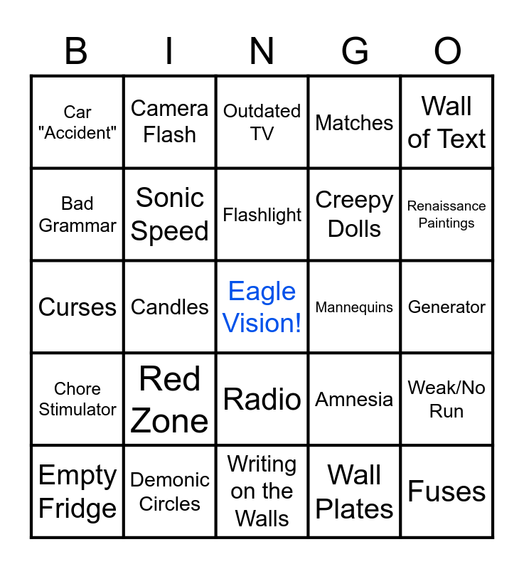 This bingo card has a free space and 37 words: Barrels, Mattresses, Flickering Lights, Sonic Speed, Weak/No Run, Red Zone, Flashlight, Lighter, Wall of Text, Drawer Stimulator, Candles, Matches, Fuses, Generator, Bad Grammar, Chore Stimulator, VHS Filter, Outdated TV, Radio, Mannequins, Car "Accident", Renaissance Paintings, Empty Fridge, Writing on the Walls, So Much Blood!, Wall Plates, Camera Flash, Shaking Bodies, Crosses, Old People, Body Bags, Demonic Circles, Curses, Mental Illness, Amnesia, Creepy Dolls and Blood Curdling Scream.