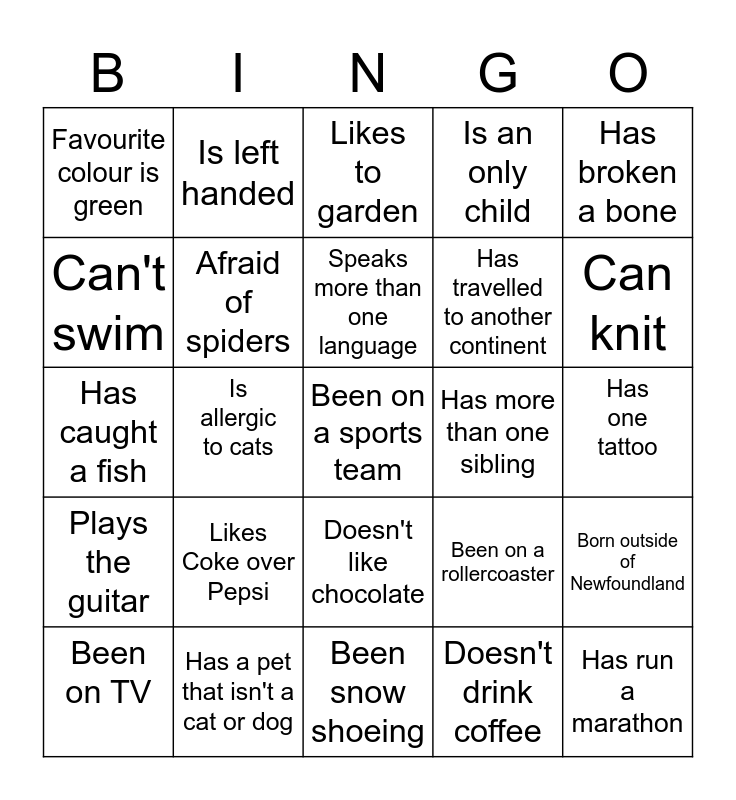 This bingo card has a free space and 24 words: Likes Coke over Pepsi, Has a pet that isn't a cat or dog, Speaks more than one language, Been on TV, Has broken a bone, Favourite colour is green, Can't swim, Is left handed, Has more than one sibling, Doesn't like chocolate, Has travelled to another continent, Has caught a fish, Been on a rollercoaster, Born outside of Newfoundland, Afraid of spiders, Doesn't drink coffee, Has one tattoo, Likes to garden, Can knit, Is allergic to cats, Has run a marathon, Plays the guitar, Is an only child and Been snow shoeing.