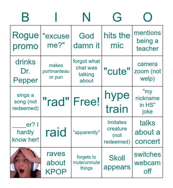 This bingo card has 1 images, a free space and 28 words: "y'all", "rad", stumbles over words, Rogue promo, God damn it, makes portmanteau or pun, raid, hype train, raves about KPOP, "my nickname in HS" joke, switches webcam off, forgets to mute/unmute things, Skoll appears, camera zoom (not welp), "pardon", "apparently", ____er? I hardly know her!, mentions being a teacher, sings a song (not redeemed), Imitates creature (not redeemed), headphones need plugged in, "cute", drinks Dr. Pepper, hits the mic, "excuse me?", talks about a concert, forgot what chat was talking about and is frustrated with her hair.