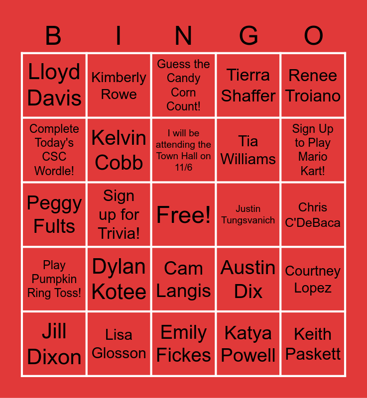 This bingo card has a free space and 29 words: Jill Dixon, Complete Open Enrollment!, Sign up for Trivia!, Jeane Beatty, Lloyd Davis, Guess the Candy Corn Count!, Kelvin Cobb, Dylan Kotee, Justin Tungsvanich, Lisa Glosson, Chris C'DeBaca, Keith Paskett, Emily Fickes, Katya Powell, Sign Up to Play Mario Kart!, Valyn Fuller, Cam Langis, Play Pumpkin Ring Toss!, Renee Troiano, Peggy Fults, Austin Dix, Amy Miller, Tia Williams, Complete Today's CSC Wordle!, Tierra Shaffer, Kimberly Rowe, Courtney Lopez, I will be attending the Town Hall on 11/6 and I gave someone a Country Mile Badge today.