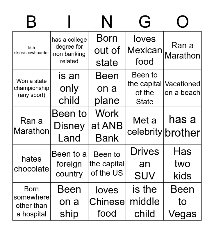 This bingo card has a free space and 24 words: Been to a foreign country, Been on a ship, Been on a plane, Born somewhere other than a hospital, Ran a Marathon, Is a skier/snowboarder, Won a state championship (any sport), has a college degree for non banking related, Met a celebrity, Been to the capital of the US, Been to the capital of the State, Ran a Marathon, Drives an SUV, Has two kids, is an only child, is the middle child, has a brother, Born out of state, Vacationed on a beach, Been to Disney Land, Been to Vegas, hates chocolate, loves Mexican food and loves Chinese food.