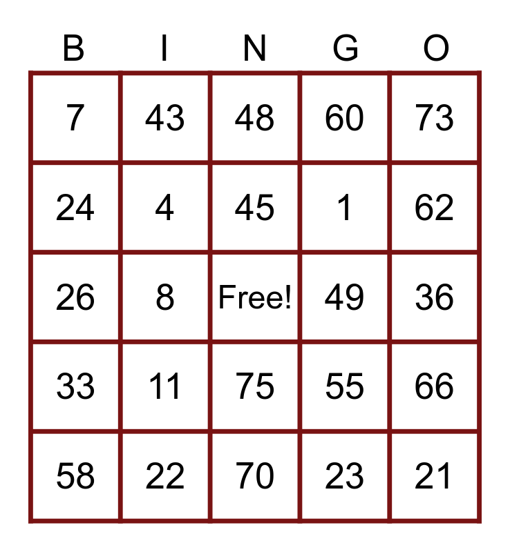 This bingo card has a free space and 24 words: 11, 22, 45, 58, 73, 7, 24, 43, 49, 75, 1, 26, 55, 66, 4, 23, 36, 48, 62, 8, 21, 33, 60 and 70.