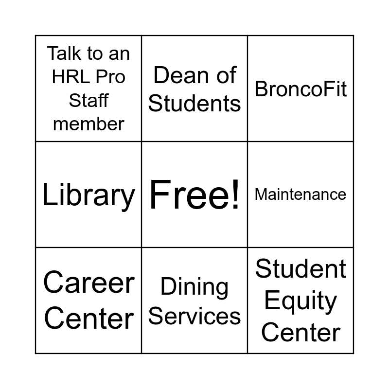 This bingo card has a free space and 8 words: Maintenance, BroncoFit, Dean of Students, Career Center, Talk to an HRL Pro Staff member, Student Equity Center, Library and Dining Services.