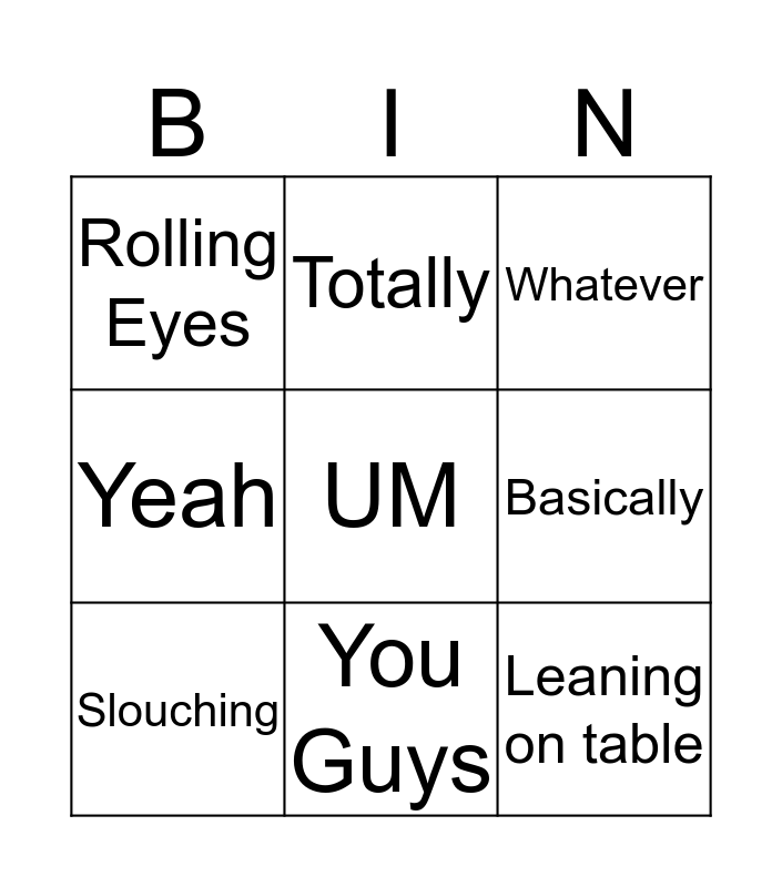 This bingo card has a free space and 8 words: Basically, Whatever, Totally, Slouching, Rolling Eyes, Leaning on table, Yeah and You Guys.