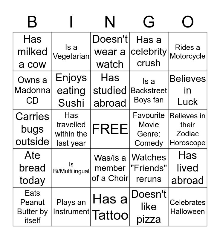This bingo card has a free space and 24 words: Is Bi/Multilingual, Plays an Instrument, Has studied abroad, Eats Peanut Butter by itself, Rides a Motorcycle, Has milked a cow, Owns a Madonna CD, Is a Vegetarian, Favourite Movie Genre: Comedy, Was/is a member of a Choir, Is a Backstreet Boys fan, Carries bugs outside, Watches "Friends" reruns, Has lived abroad, Enjoys eating Sushi, Doesn't like pizza, Believes in their Zodiac Horoscope, Doesn't wear a watch, Believes in Luck, Has travelled within the last year, Celebrates Halloween, Ate bread today, Has a celebrity crush and Has a Tattoo.