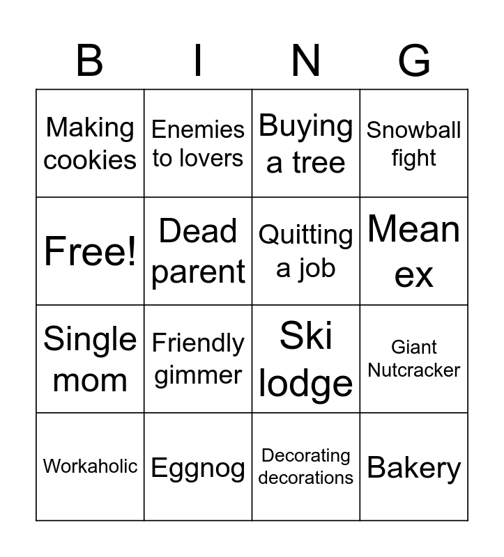 This bingo card has 16 words: Eggnog, Giant Nutcracker, Buying a tree, Making cookies, Single mom, Enemies to lovers, Ski lodge, Decorating decorations, Free!, Dead parent, Workaholic, Snowball fight, Friendly gimmer, Mean ex, Quitting a job and Bakery.