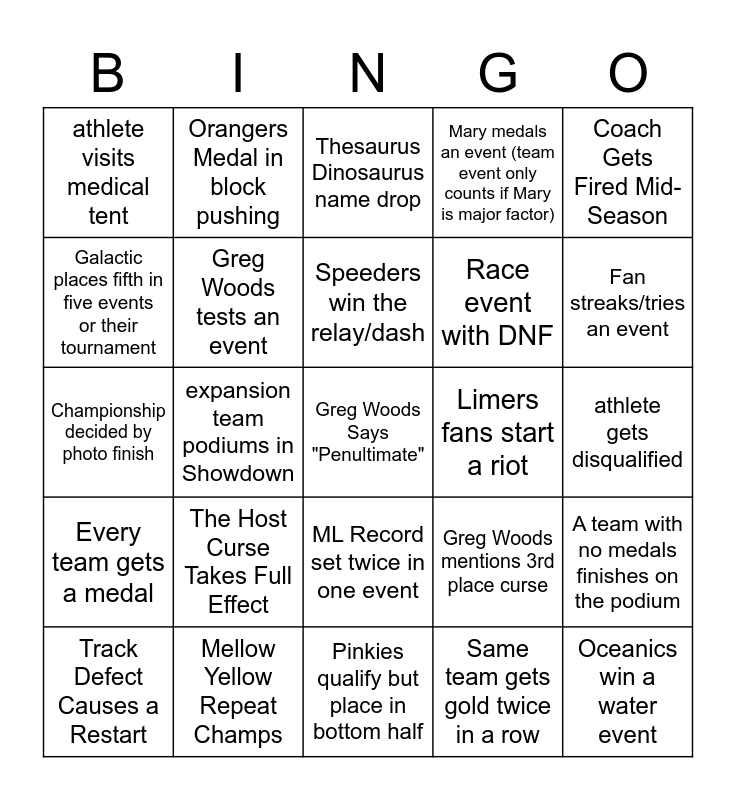 This bingo card has a free space and 24 words: The Host Curse Takes Full Effect, Mellow Yellow Repeat Champs, Speeders win the relay/dash, Track Defect Causes a Restart, Coach Gets Fired Mid-Season, athlete visits medical tent, Galactic places fifth in five events or their tournament, Orangers Medal in block pushing, Limers fans start a riot, ML Record set twice in one event, Race event with DNF, Championship decided by photo finish, Greg Woods mentions 3rd place curse, A team with no medals finishes on the podium, Greg Woods tests an event, Same team gets gold twice in a row, athlete gets disqualified, Thesaurus Dinosaurus name drop, Fan streaks/tries an event, expansion team podiums in Showdown, Oceanics win a water event, Every team gets a medal, Mary medals an event (team event only counts if Mary is major factor) and Pinkies qualify but place in bottom half.