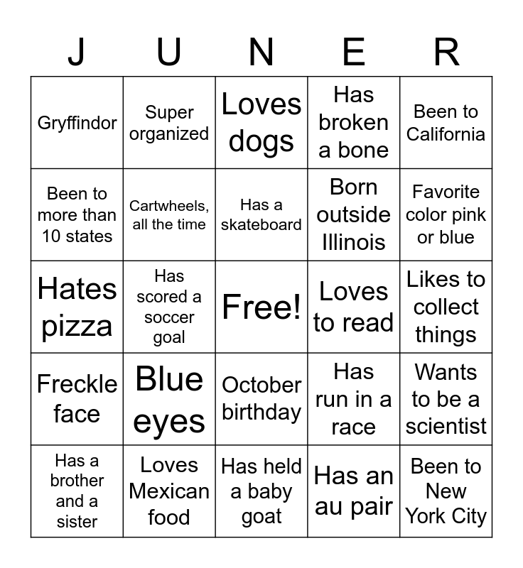 This bingo card has a free space and 24 words: Blue eyes, Loves Mexican food, Has a skateboard, Has a brother and a sister, Been to California, Gryffindor, Been to more than 10 states, Super organized, Loves to read, October birthday, Born outside Illinois, Hates pizza, Has run in a race, Wants to be a scientist, Cartwheels, all the time, Has an au pair, Likes to collect things, Loves dogs, Favorite color pink or blue, Has scored a soccer goal, Been to New York City, Freckle face, Has broken a bone and Has held a baby goat.