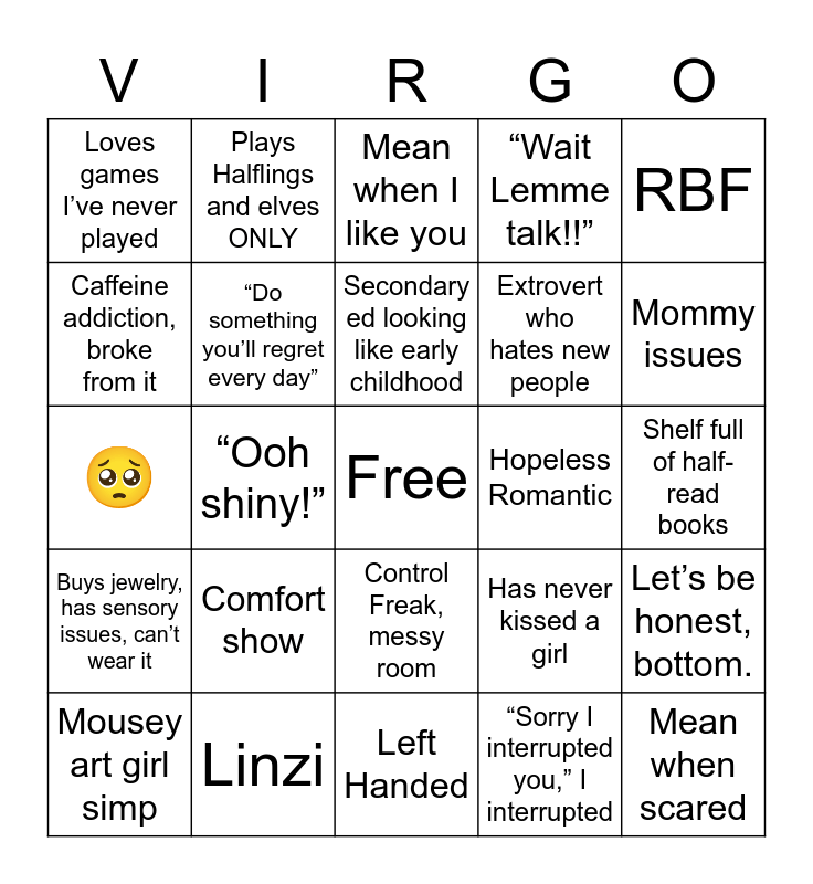 This bingo card has a free space and 24 words: Mousey art girl simp, Comfort show, Secondary ed looking like early childhood, “Sorry I interrupted you,” I interrupted, RBF, Loves games I’ve never played, Plays Halflings and elves ONLY, Mean when I like you, Hopeless Romantic, Shelf full of half-read books, 🥺, “Do something you’ll regret every day”, Has never kissed a girl, Let’s be honest, bottom., Caffeine addiction, broke from it, Linzi, Left Handed, “Wait Lemme talk!!”, Mommy issues, Buys jewelry, has sensory issues, can’t wear it, “Ooh shiny!”, Control Freak, messy room, Extrovert who hates new people and Mean when scared.