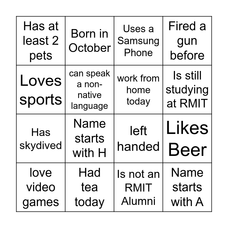 This bingo card has 16 words: Had tea today, Likes Beer, Uses a Samsung Phone, Has at least 2 pets, Has skydived, Born in October, left handed, Is not an RMIT Alumni, Loves sports, can speak a non-native language, love video games, Fired a gun before, Name starts with H, Is still studying at RMIT, work from home today and Name starts with A.