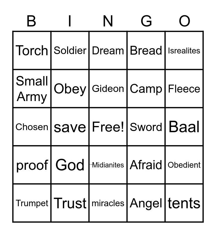 This bingo card has 1 images, a free space and 24 words: God, Trust, Gideon, Trumpet, Isrealites, Torch, Small Army, Soldier, Sword, Midianites, Camp, Chosen, Afraid, Obedient, Obey, Angel, Baal, Dream, Fleece, save, tents, proof, Bread and miracles.