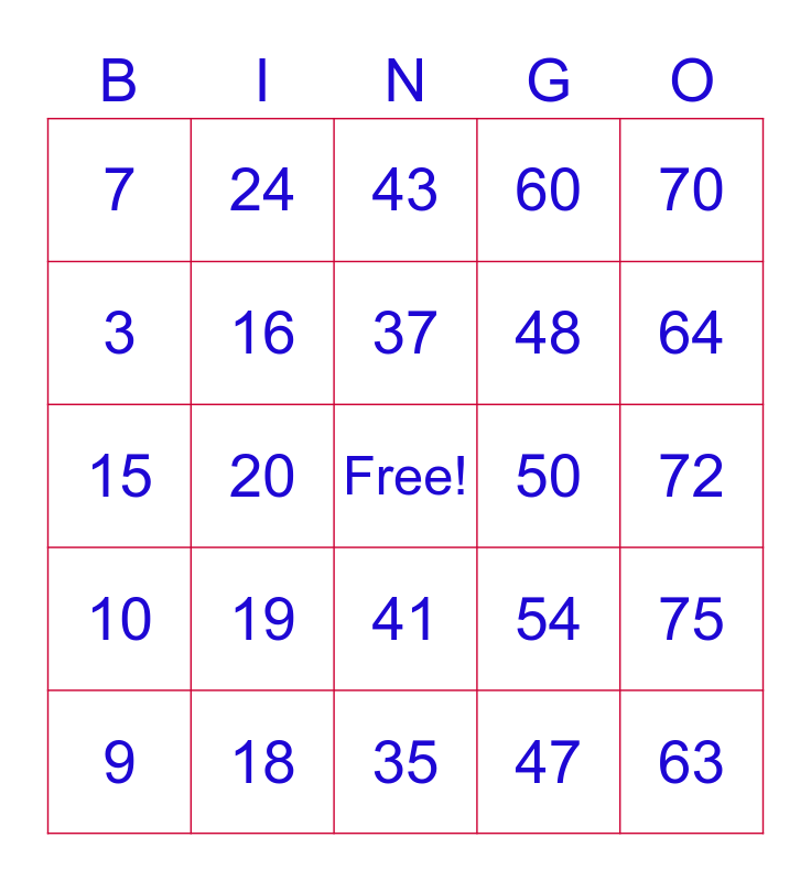 This bingo card has a free space and 24 words: 9, 19, 37, 47, 70, 7, 24, 43, 50, 72, 15, 16, 54, 75, 3, 18, 35, 60, 64, 10, 20, 41, 48 and 63.