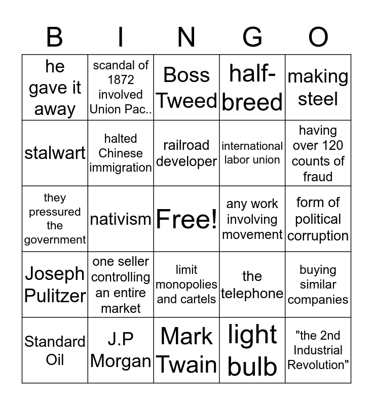 This bingo card has a free space and 24 words: one seller controlling an entire market, J.P Morgan, railroad developer, Standard Oil, making steel, he gave it away, stalwart, scandal of 1872 involved Union Pac.., any work involving movement, limit monopolies and cartels, international labor union, they pressured the government, the telephone, buying similar companies, halted Chinese immigration, light bulb, form of political corruption, Boss Tweed, having over 120 counts of fraud, nativism, "the 2nd Industrial Revolution", Joseph Pulitzer, half-breed and Mark Twain.