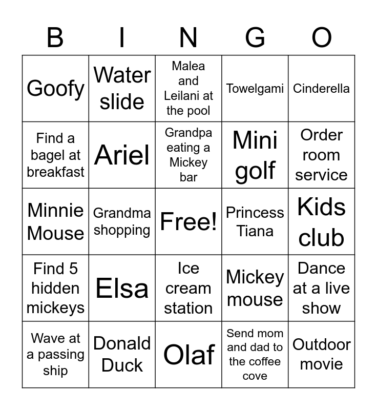 This bingo card has a free space and 24 words: Elsa, Donald Duck, Grandpa eating a Mickey bar, Wave at a passing ship, Cinderella, Goofy, Find a bagel at breakfast, Water slide, Princess Tiana, Ice cream station, Mini golf, Minnie Mouse, Mickey mouse, Dance at a live show, Ariel, Send mom and dad to the coffee cove, Kids club, Malea and Leilani at the pool, Order room service, Grandma shopping, Outdoor movie, Find 5 hidden mickeys, Towelgami and Olaf.