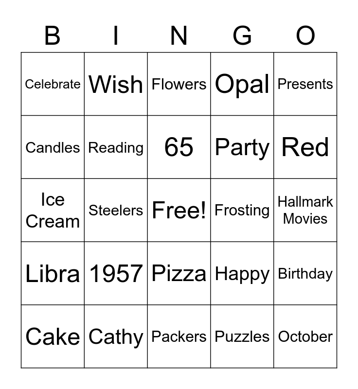 This bingo card has a free space and 24 words: 1957, Cathy, 65, Cake, Presents, Celebrate, Candles, Wish, Frosting, Pizza, Party, Ice Cream, Happy, Birthday, Reading, Puzzles, Hallmark Movies, Flowers, Red, Steelers, October, Libra, Opal and Packers.