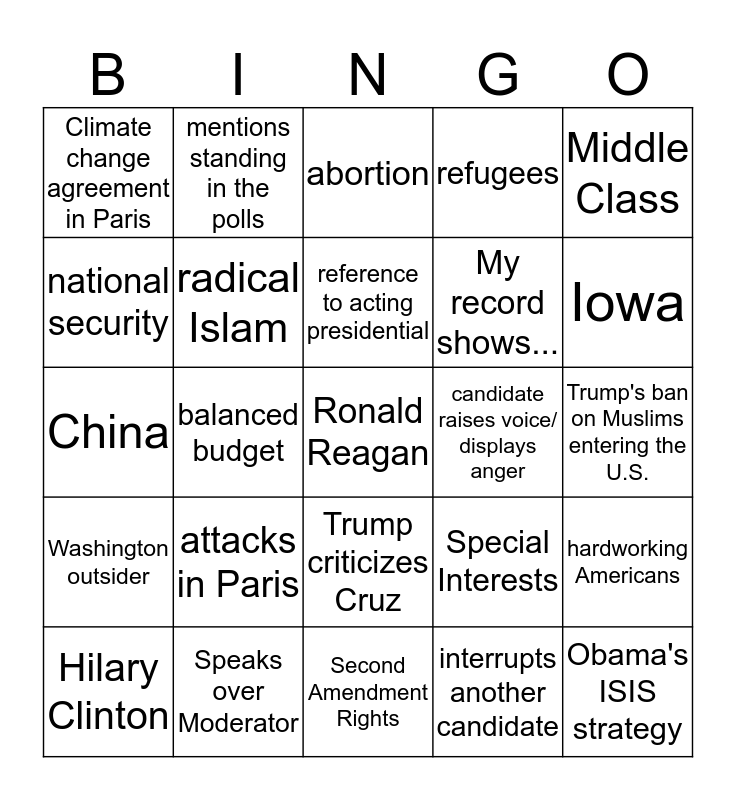 This bingo card has 25 words: attacks in Paris, Second Amendment Rights, reference to acting presidential, Hilary Clinton, Middle Class, Climate change agreement in Paris, national security, mentions standing in the polls, candidate raises voice/ displays anger, Trump criticizes Cruz, My record shows..., China, Special Interests, hardworking Americans, radical Islam, Obama's ISIS strategy, Trump's ban on Muslims entering the U.S., abortion, Iowa, balanced budget, Ronald Reagan, Speaks over Moderator, Washington outsider, refugees and interrupts another candidate.