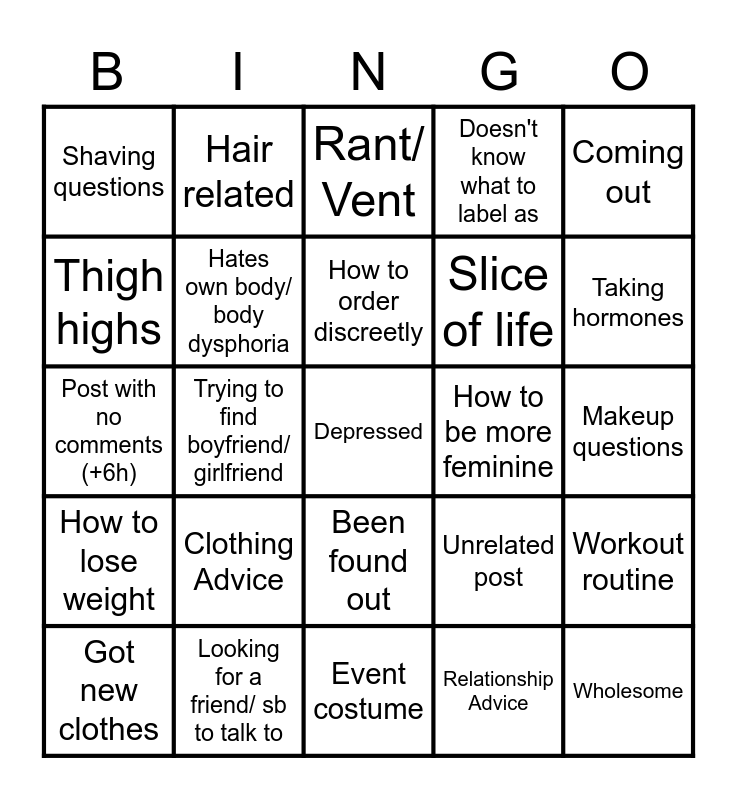 This bingo card has 25 words: Clothing Advice, Event costume, How to order discreetly, Got new clothes, Coming out, Shaving questions, Thigh highs, Hair related, How to be more feminine, Been found out, Slice of life, Post with no comments (+6h), Unrelated post, Workout routine, Hates own body/ body dysphoria, Wholesome, Makeup questions, Rant/ Vent, Taking hormones, Trying to find boyfriend/ girlfriend, Depressed, Looking for a friend/ sb to talk to, How to lose weight, Doesn't know what to label as and Relationship Advice.