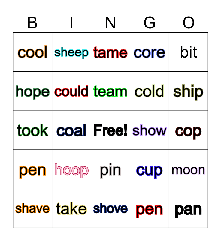 This bingo card has a free space and 28 words: moon, shoe, cold, pen, hope, tame, sheep, pen, show, shave, took, core, take, shove, ship, car, hoop, could, team, pin, cool, moan, pan, coal, cop, cup, bit and bite.