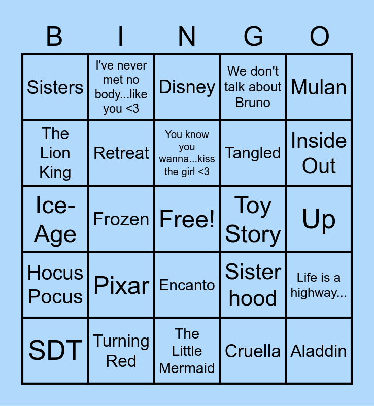 This bingo card has a free space and 29 words: SDT, Stitch, Frozen, Yellow Tea Rose, Sisters, Disney, Retreat, Pixar, Toy Story, Turning Red, Up, Aladdin, The Little Mermaid, Cruella, Inside Out, Finding Nemo, Encanto, Hocus Pocus, Mulan, Ice-Age, Sister hood, Baby Yoda, Tangled, The Lion King, We don't talk about Bruno, I've never met no body...like you <3, Life is a highway..., You know you wanna...kiss the girl <3 and Tarzan.