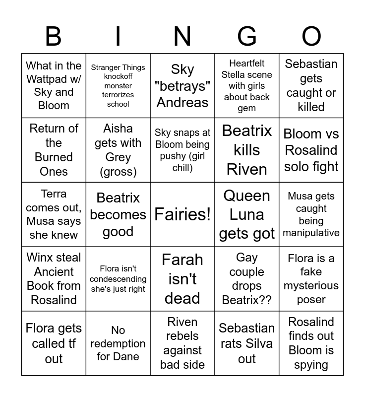 This bingo card has a free space and 24 words: Flora isn't condescending she's just right, No redemption for Dane, Sky snaps at Bloom being pushy (girl chill), Flora gets called tf out, Sebastian gets caught or killed, What in the Wattpad w/ Sky and Bloom, Return of the Burned Ones, Stranger Things knockoff monster terrorizes school, Queen Luna gets got, Farah isn't dead, Beatrix kills Riven, Terra comes out, Musa says she knew, Gay couple drops Beatrix??, Flora is a fake mysterious poser, Aisha gets with Grey (gross), Sebastian rats Silva out, Musa gets caught being manipulative, Sky "betrays" Andreas, Bloom vs Rosalind solo fight, Beatrix becomes good, Rosalind finds out Bloom is spying, Winx steal Ancient Book from Rosalind, Heartfelt Stella scene with girls about back gem and Riven rebels against bad side.