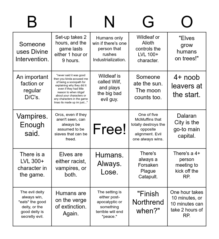 This bingo card has a free space and 24 words: Elves are either racist, vampires, or both., Humans are on the verge of extinction. Again., Wildleaf is called Wilf, and plays the big bad evil guy., The evil deity always win, "eats" the good deity, or the good deity is secretly evil., "Elves grow humans on trees!", Someone uses Divine Intervention., An important faction or regular D/C's., Set-up takes 2 hours, and the game lasts either 1 hour or 9 hours., One of five McMuffins that totally destroys the opposite alignment. Evil one always wins., Humans. Always. Lose., Someone ate the sun. The moon counts too., Vampires. Enough said., There's always a Forsaken Plague Catapult., There's a 4+ person meeting to kick off the RP., "never said it was good then you kinda accused me of being a sociopath for explaining why they did it even if they had little reason to when idrgaf about your characters or any characters in the game lmao its made up im just...", "Finish Northrend when?", Dalaran City is the go-to main capital., Humans only win if there's one person that rushes Industrialization., 4+ noob leavers at the start., Orcs, even if they aren't seen, can always be assumed to be slaves that can be freed., One hour takes 10 minutes, or 10 minutes can take 2 hours of RP., There is a LVL 300+ character in the game., Wildleaf or Alioth controls the LVL 100+ character. and The setting is either post-apocalyptic or something terrible will end "peace.".