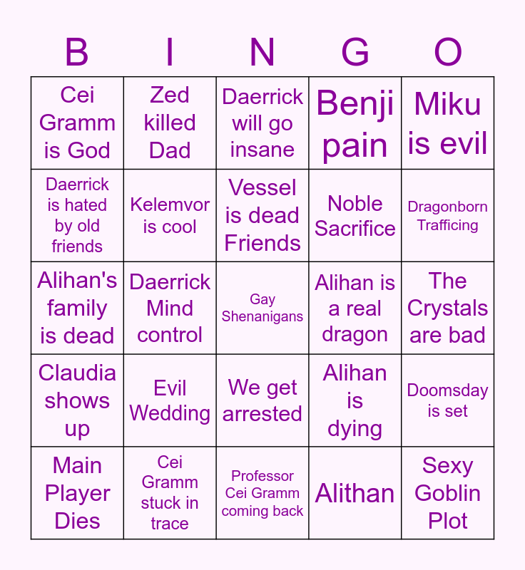 This bingo card has a free space and 24 words: Main Player Dies, Evil Wedding, Vessel is dead Friends, Alithan, Miku is evil, Cei Gramm is God, Zed killed Dad, Daerrick will go insane, Alihan is a real dragon, The Crystals are bad, Alihan's family is dead, Kelemvor is cool, Alihan is dying, Doomsday is set, Daerrick is hated by old friends, Cei Gramm stuck in trace, Professor Cei Gramm coming back, Benji pain, Dragonborn Trafficing, Claudia shows up, Daerrick Mind control, We get arrested, Noble Sacrifice and Sexy Goblin Plot.