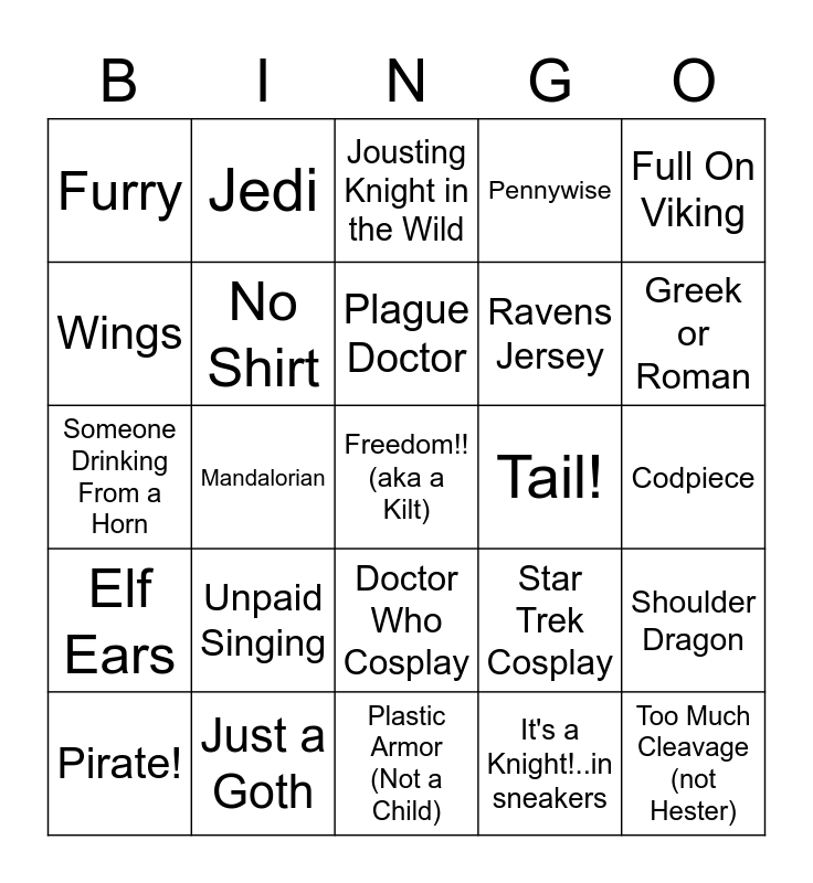 This bingo card has a free space and 29 words: Pirate!, LOTR Cosplay, Mandalorian, Mushroom Family 🍄, Furry, Jousting Knight in the Wild, No Shirt, Unpaid Singing, Tail!, Just a Goth, Codpiece, Too Much Cleavage (not Hester), Plastic Armor (Not a Child), It's a Knight!..in sneakers, Greek or Roman, Double Fisting Handheld Meats, Doctor Who Cosplay, Elf Ears, Full On Viking, Someone Drinking From a Horn, Star Trek Cosplay, Fandom Mashup, Ravens Jersey, Wings, Pennywise, Jedi, Shoulder Dragon, Plague Doctor and Actual Spaceship.