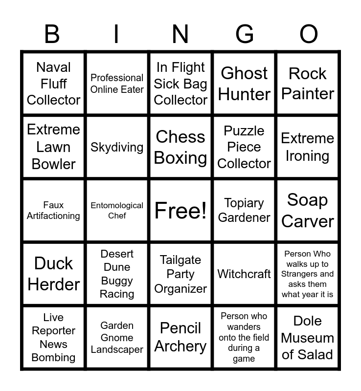 This bingo card has a free space and 36 words: Hikaru Dorodango a.k.a Mud Polishing, Tree Carving, Extreme Couponing, Skydiving, Witchcraft, Duck Herder, Chess Boxing, Recreational Kidnapper, Rock Painter, It is so quiet here, Entomological Chef, Ghost Hunter, Competitive Dog Groomer, Topiary Gardener, Extreme Ironing, Naval Fluff Collector, Beetle Fighting, Desert Dune Buggy Racing, Dole Museum of Salad, In Flight Sick Bag Collector, Soap Carver, Person Who walks up to Strangers and asks them what year it is, Garden Gnome Landscaper, Live Reporter News Bombing, Pencil Archery, Professional Online Eater, Faux Artifactioning, Mall Shopper who walks slow and stops short, Puzzle Piece Collector, Extreme Lawn Bowler, Alpaca Hunter, Disoriented Tourist, Person who wanders onto the field during a game, Tailgate Party Organizer, Mystic and Leaf Cutter Ant Shepherding.