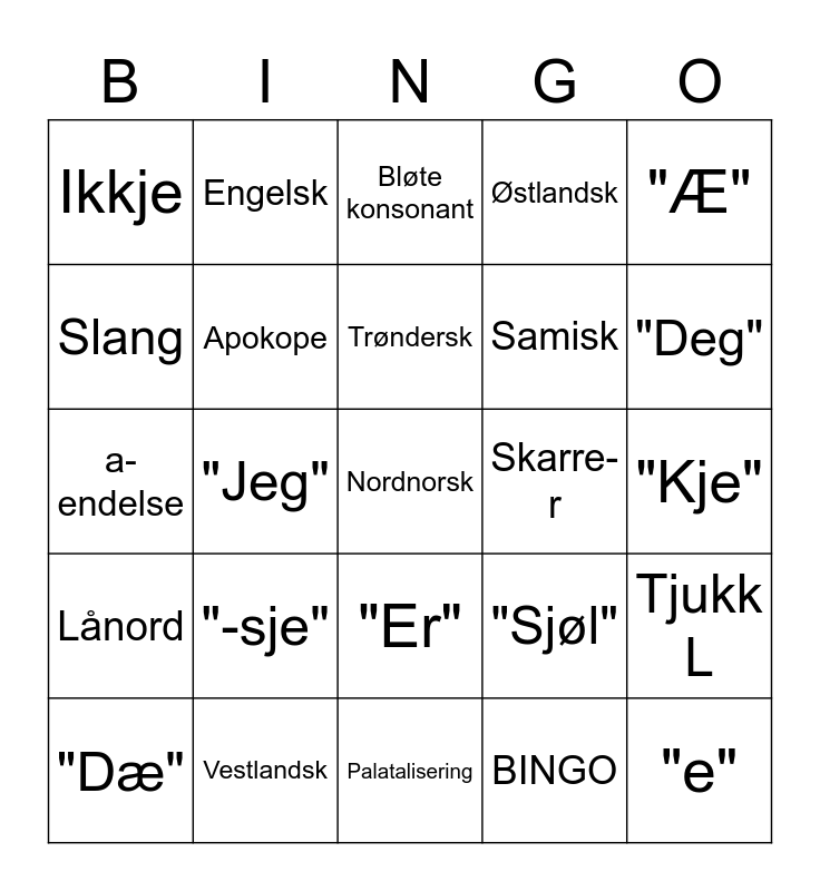 This bingo card has 25 words: "-sje", Palatalisering, Trøndersk, "Dæ", "Æ", Ikkje, Slang, Engelsk, Skarre-r, "Er", Samisk, a-endelse, "Sjøl", Tjukk L, Apokope, "e", "Kje", Bløte konsonant, "Deg", "Jeg", Nordnorsk, Vestlandsk, Lånord, Østlandsk and BINGO.