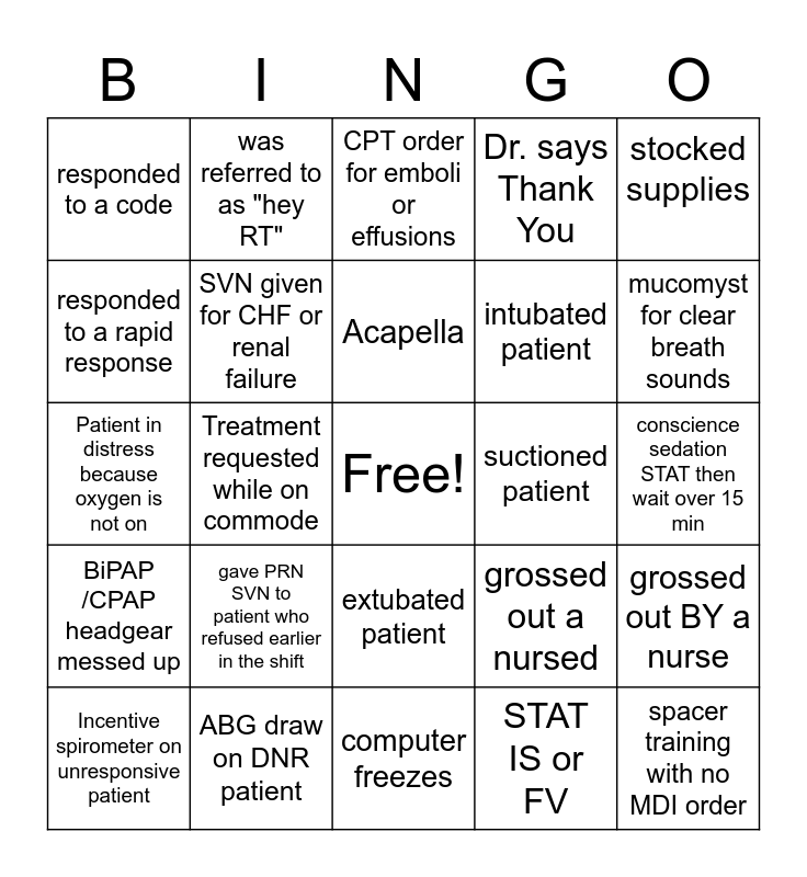 This bingo card has a free space and 24 words: gave PRN SVN to patient who refused earlier in the shift, ABG draw on DNR patient, Acapella, Incentive spirometer on unresponsive patient, stocked supplies, responded to a code, responded to a rapid response, was referred to as "hey RT", suctioned patient, extubated patient, intubated patient, Patient in distress because oxygen is not on, grossed out a nursed, grossed out BY a nurse, SVN given for CHF or renal failure, STAT IS or FV, conscience sedation STAT then wait over 15 min, CPT order for emboli or effusions, mucomyst for clear breath sounds, Treatment requested while on commode, spacer training with no MDI order, BiPAP /CPAP headgear messed up, Dr. says Thank You and computer freezes.