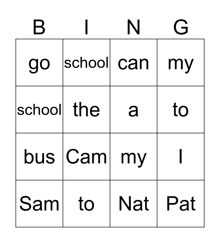 This bingo card has a free space and 15 words: Sam, Pat, can, go, to, school, Cam, Nat, the, bus, I, my, a, school and to.