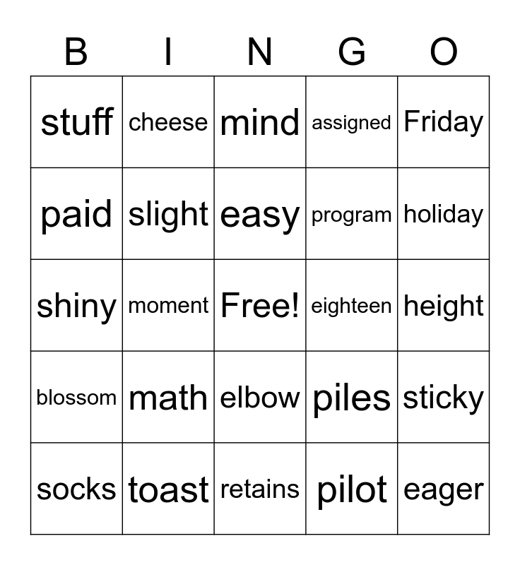 This bingo card has a free space and 24 words: math, toast, easy, socks, Friday, stuff, paid, cheese, eighteen, elbow, program, shiny, piles, sticky, slight, pilot, height, mind, holiday, moment, eager, blossom, assigned and retains.