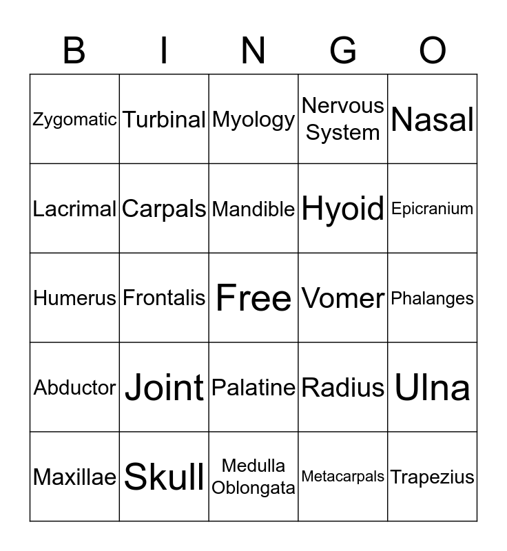 This bingo card has a free space and 24 words: Joint, Skull, Mandible, Maxillae, Nasal, Zygomatic, Lacrimal, Turbinal, Vomer, Palatine, Hyoid, Humerus, Radius, Ulna, Carpals, Metacarpals, Phalanges, Myology, Epicranium, Frontalis, Trapezius, Abductor, Nervous System and Medulla Oblongata.