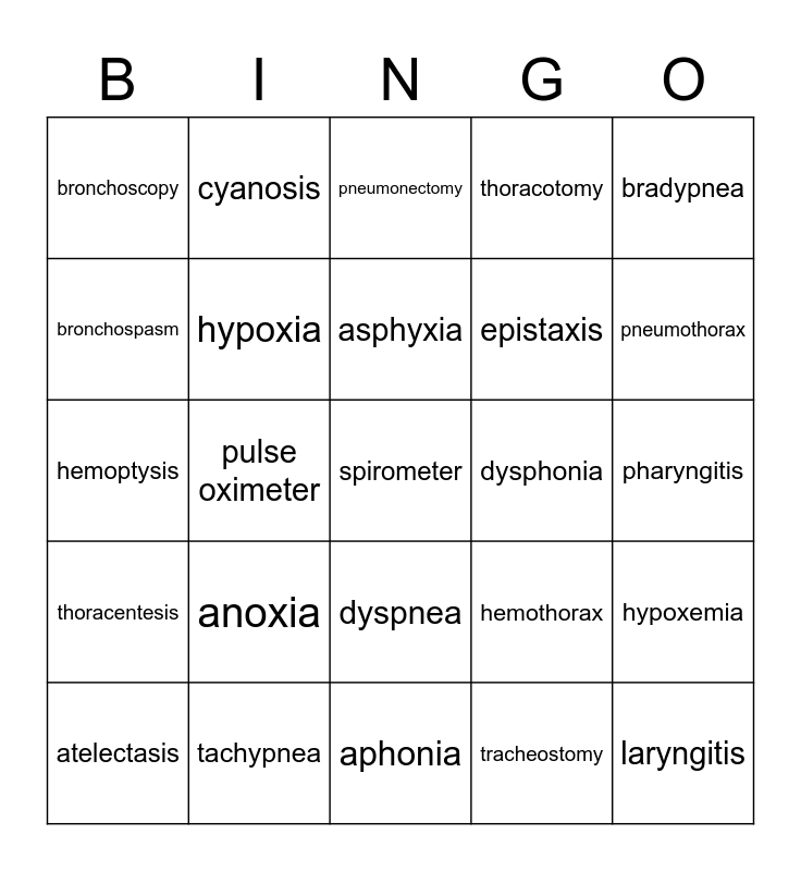 This bingo card has 25 words: anoxia, aphonia, asphyxia, atelectasis, bradypnea, bronchoscopy, bronchospasm, cyanosis, dysphonia, dyspnea, epistaxis, hemoptysis, hemothorax, hypoxemia, hypoxia, laryngitis, pharyngitis, pneumonectomy, pneumothorax, pulse oximeter, spirometer, tachypnea, thoracentesis, thoracotomy and tracheostomy.