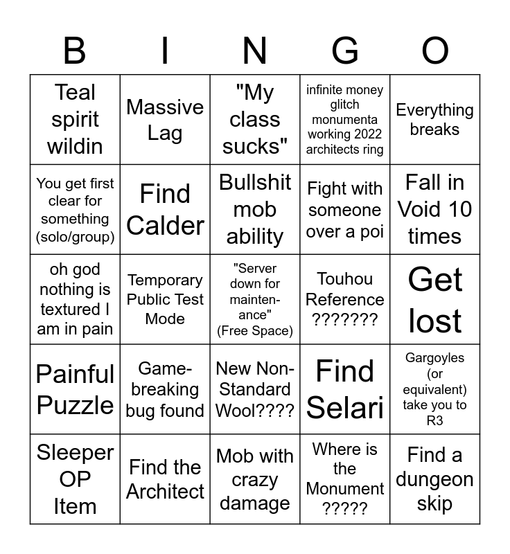 This bingo card has a free space and 24 words: Game-breaking bug found, Find the Architect, Bullshit mob ability, Sleeper OP Item, Everything breaks, Teal spirit wildin, You get first clear for something (solo/group), Massive Lag, Touhou Reference ???????, New Non- Standard Wool????, Fight with someone over a poi, oh god nothing is textured I am in pain, Find Selari, Gargoyles (or equivalent) take you to R3, Find Calder, Where is the Monument ?????, Get lost, "My class sucks", Fall in Void 10 times, Temporary Public Test Mode, Find a dungeon skip, Painful Puzzle, infinite money glitch monumenta working 2022 architects ring and Mob with crazy damage.
