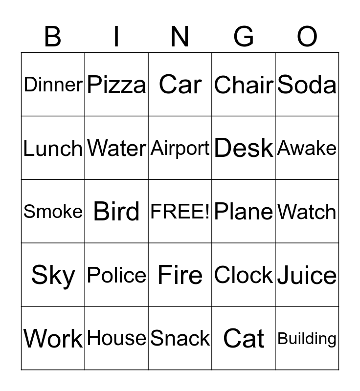 This bingo card has a free space and 32 words: Cat, Dog, Bird, Turtle, Sky, Water, Soda, Juice, Pizza, Jackson, Airport, Car, Truck, Boat, Plane, School, Work, Smoke, Fire, Police, Clock, Radio, Watch, House, Building, Chair, Desk, Lunch, Dinner, Snack, Sleep and Awake.