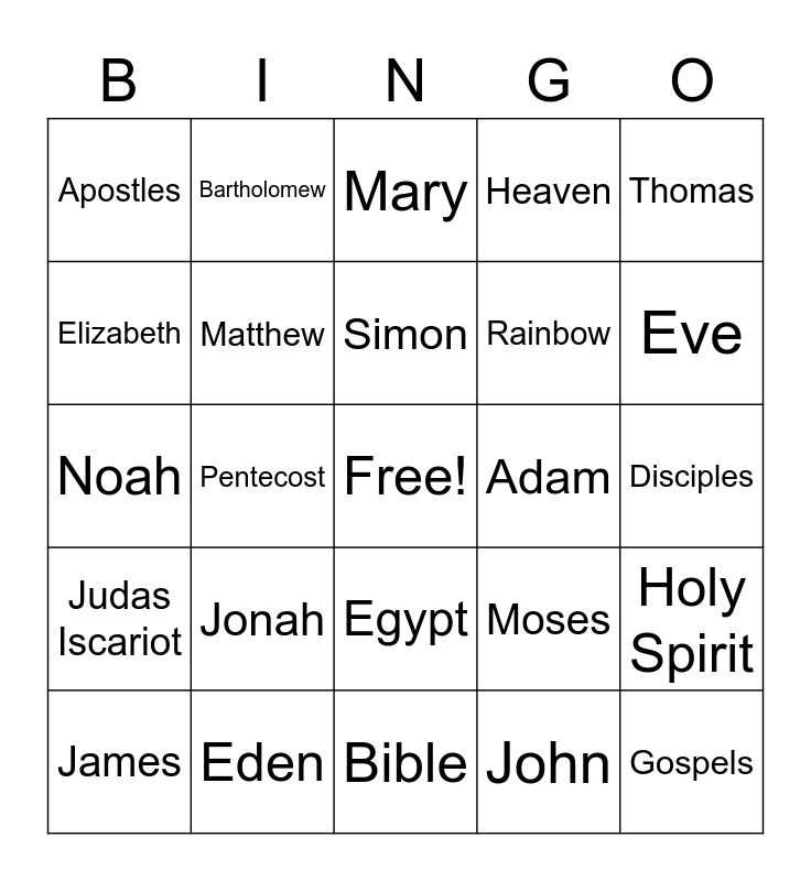 This bingo card has a free space and 34 words: Peter, John, Andrew, Philip, Judas Iscariot, Matthew, Thomas, James, Bartholomew, Judas Thaddeus, Simon, Mary, Jesus, Gabriel, Adam, Eve, Eden, Noah, Jonah, Moses, Egypt, Bethlehem, Apostles, Disciples, Bible, Gospels, Heaven, Creation, Rainbow, Elizabeth, 10 Commandments, Pentecost, Holy Spirit and Easter.
