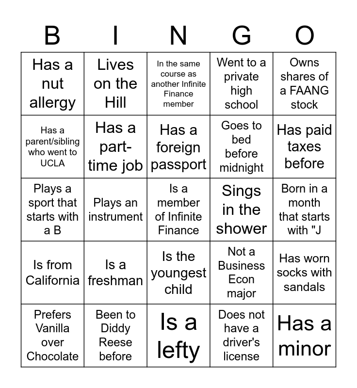 This bingo card has a free space and 24 words: Is a freshman, Been to Diddy Reese before, Has a foreign passport, Prefers Vanilla over Chocolate, Owns shares of a FAANG stock, Has a nut allergy, Has a parent/sibling who went to UCLA, Lives on the Hill, Sings in the shower, Is the youngest child, Goes to bed before midnight, Plays a sport that starts with a B, Not a Business Econ major, Has worn socks with sandals, Has a part-time job, Does not have a driver's license, Born in a month that starts with "J, In the same course as another Infinite Finance member, Has paid taxes before, Plays an instrument, Has a minor, Is from California, Went to a private high school and Is a lefty.