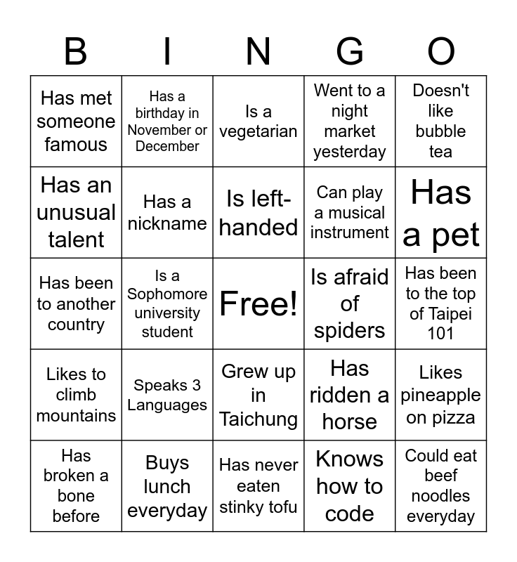 This bingo card has a free space and 24 words: Speaks 3 Languages, Buys lunch everyday, Is left-handed, Has broken a bone before, Doesn't like bubble tea, Has met someone famous, Has an unusual talent, Has a birthday in November or December, Is afraid of spiders, Grew up in Taichung, Can play a musical instrument, Has been to another country, Has ridden a horse, Likes pineapple on pizza, Has a nickname, Knows how to code, Has been to the top of Taipei 101, Is a vegetarian, Has a pet, Is a Sophomore university student, Could eat beef noodles everyday, Likes to climb mountains, Went to a night market yesterday and Has never eaten stinky tofu.