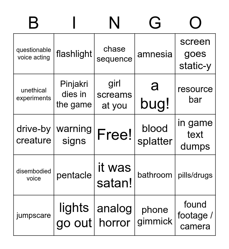 This bingo card has a free space and 44 words: YOU were the monster all along, found footage / camera, silly plot twist, jumpscare, heavy breathing, phone gimmick, chase sequence, hiding sequence, screen goes static-y, lights go out, amnesia, blood splatter, it was satan!, pentacle, candles, analog horror, raspy voice, drive-by creature, cross, resource bar, flashlight, hospital, whispers, questionable voice acting, stealth mechanic, in game text dumps, exposition text dump, sacrifice, bathroom, disembodied voice, corpse, pills/drugs, puzzles, chain link fence, warning signs, press <key> to sprint, that sure is a painting, loud door sfx, girl screams at you, unethical experiments, a bug!, a deal with the devil, Pinjakri dies in the game and anticlimactic ending.