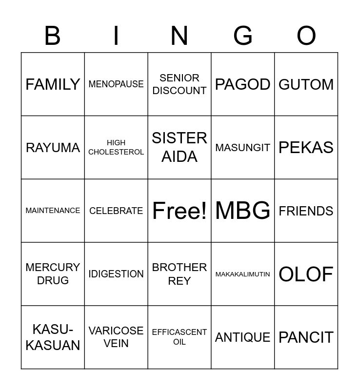 This bingo card has a free space and 27 words: MAKAKALIMUTIN, HIGH BLOOD, MASUNGIT, EFFICASCENT OIL, RAYUMA, SENIOR DISCOUNT, MENOPAUSE, MERCURY DRUG, MBG, OLOF, MAINTENANCE, PAGOD, KASU-KASUAN, VARICOSE VEIN, PEKAS, AMVASC, HIGH CHOLESTEROL, SISTER AIDA, IDIGESTION, FAMILY, FRIENDS, ANTIQUE, CELEBRATE, PANCIT, BROTHER REY, GUTOM and ANLENE.