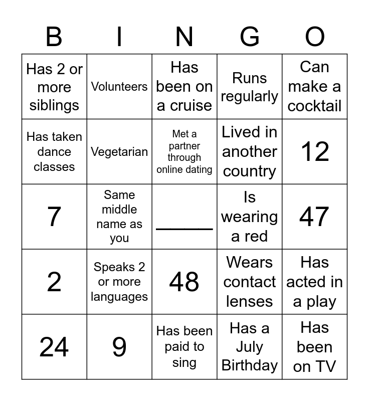 This bingo card has a free space and 49 words: Played in a band, Has been on TV, Has a tattoo, Has been paid to sing, Speaks 2 or more languages, House shares/ lives with roommates, Volunteers, Has been scuba diving, Has taken dance classes, Plays an instrument, Vegetarian, Runs regularly, Has acted in a play, Wears contact lenses, Left Handed, Enjoys camping, Met a partner through online dating, Is wearing a red, Has a cat, Can make a cocktail, Same middle name as you, Has a July Birthday, Has 2 or more siblings, Lived in another country, Attended a wedding this year, 12, 24, Started a business, 48, 2, 15, Does Yoga, 31, Can do a cartwheel, 9, 19, Only Child, Attended a concert this year, 47, Never learned to ride a bike, 11, 30, 33, 42, 7, Has been on a cruise, 21, 34 and Drives an automatic.